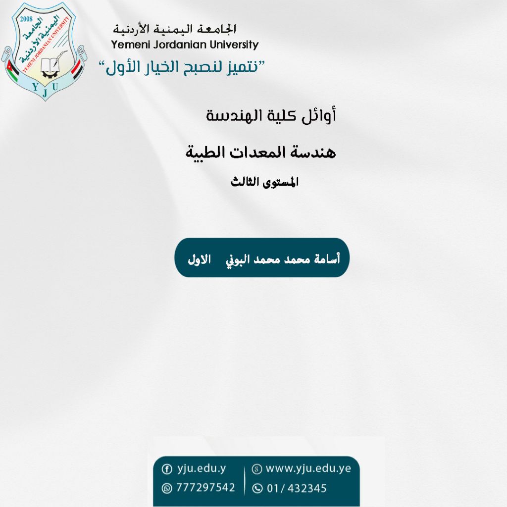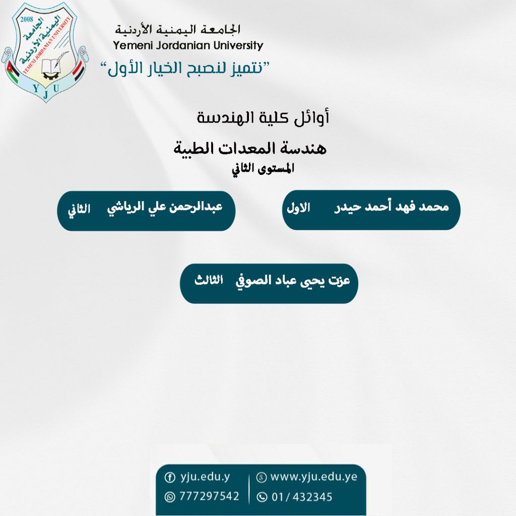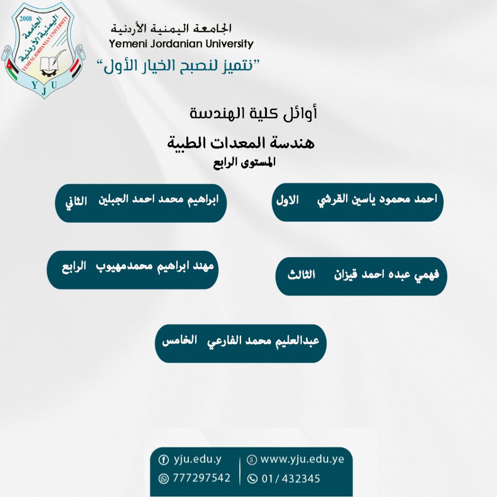 أخبار الجامعة اخبار كلية الهندسة 15/12/2025 أوائل كلــــية الهندسة نــبارك لأبـــنائنا وبــناتنا الأوائل ونتمــى لهــم مســـتقبلاً مشــرقاً ومليئــاً بالنجــاح والتــألق في مسيرتهم الأكاديمية. #الجامعة اليمنية الأردنية #عضو_اتحاد_الجامعات_الأهلية. #عضو_اتحاد_الجامعات_العربية. #الجامعة_اليمنية_الأردنية. #نتميز_لنصبح_الخيار_الأول